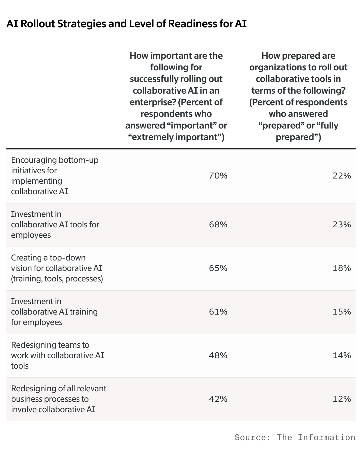 The Information’s survey confirms that companies are not yet ready for AI implementation, with less than a quarter prepared for any area related to AI (from 23% who have invested in collaborative AI tools for employees to 12% who have redesigned relevant business processes to involve collaborative AI).