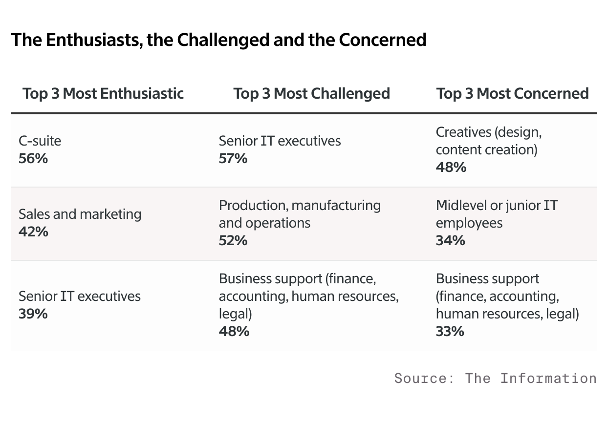 The Information’s survey shows that employees’ levels of enthusiasm, challenge and concern about AI vary depending on the roles they have in the organizations (see the chart “The Enthusiasts, the Challenged and the Concerned”).