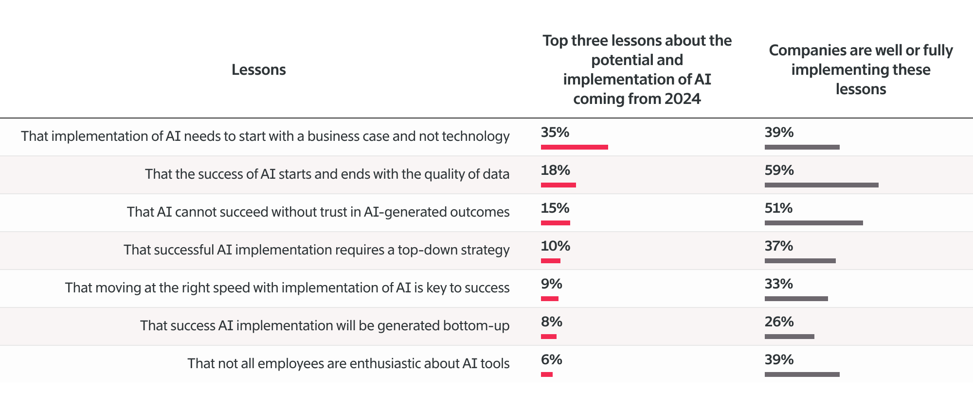 The issue of data quality is also tied to trust. The lesson that AI cannot succeed without trust in AI-generated outcomes comes in as the third most important in The Information’s survey. Efforts to build trust in AI are the second most widely implemented lesson at 51%. But that trust will not be built overnight. Just 24% of The Information’s readers who responded to the survey think in 2025 people and organizations will learn to trust AI-generated outcomes.